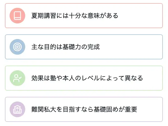 結論から言えば、夏期講習には十分な意味があります。ただし、その効果は塾の種類や受験生本人のレベルによって大きく異なります。