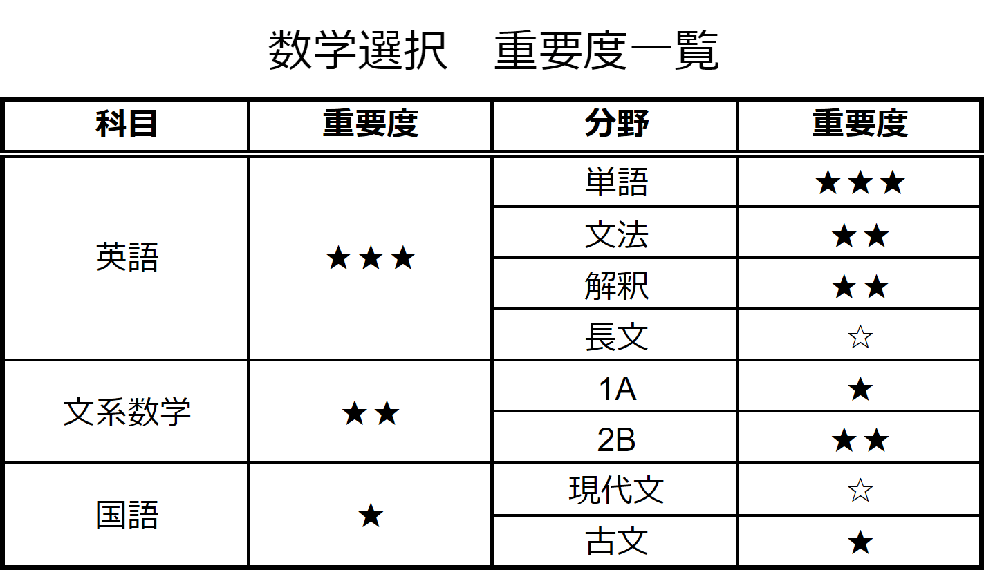 文系数学選択では優先順位が変わり、英語>文系数学>国語 となります。