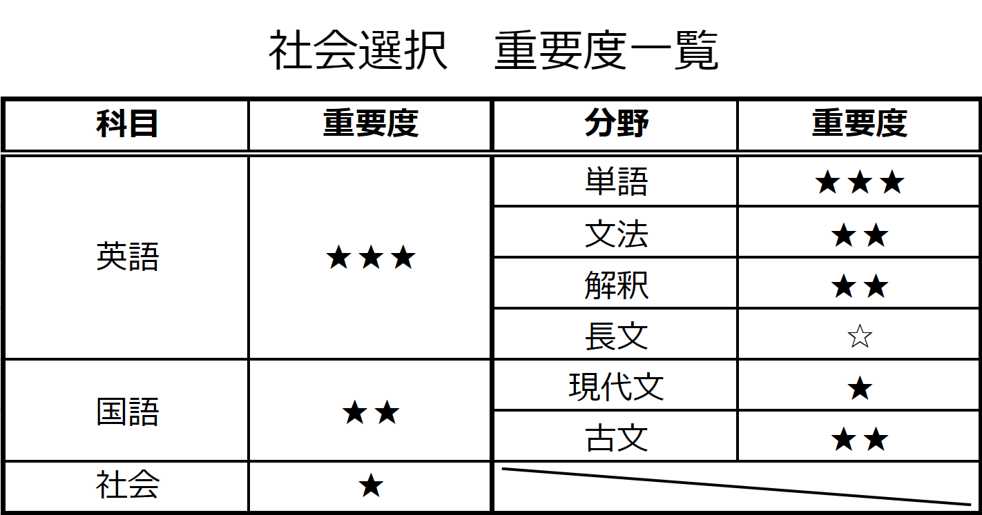 社会選択の場合、国語を現代文と古文に分解して考えると 英語>社会>現代文>古文 の順で配点が高いことが多いです。