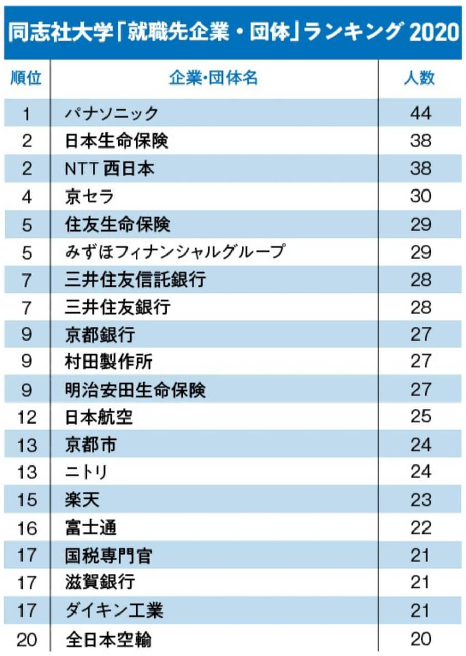 同志社大学の就職先ランキング第1位は「パナソニック」でした。